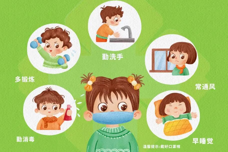 勤洗手,肥皂+流动水20秒以上;多通风,每日开窗通风两次,每次30分钟;戴口罩,避免前往人群密集场所,减少感染风险;定期给门把手、手机、桌面等消毒;咳嗽/打喷嚏用肘部或纸巾遮挡口鼻。