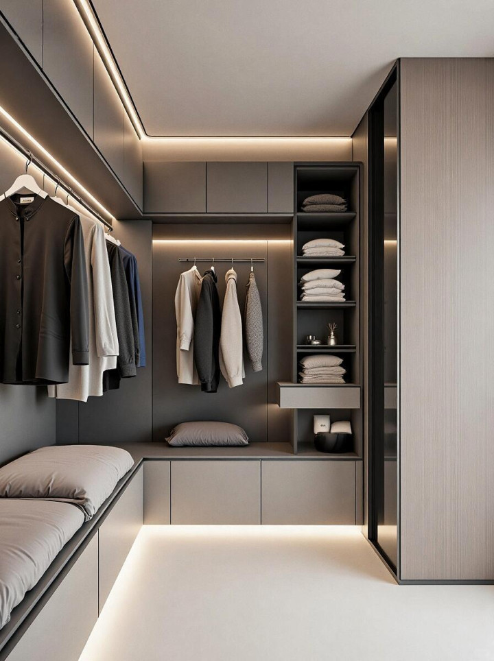 配先查 意式极简理性的线条木香温馨, 连衣帽间都是这样的高级感满满。
