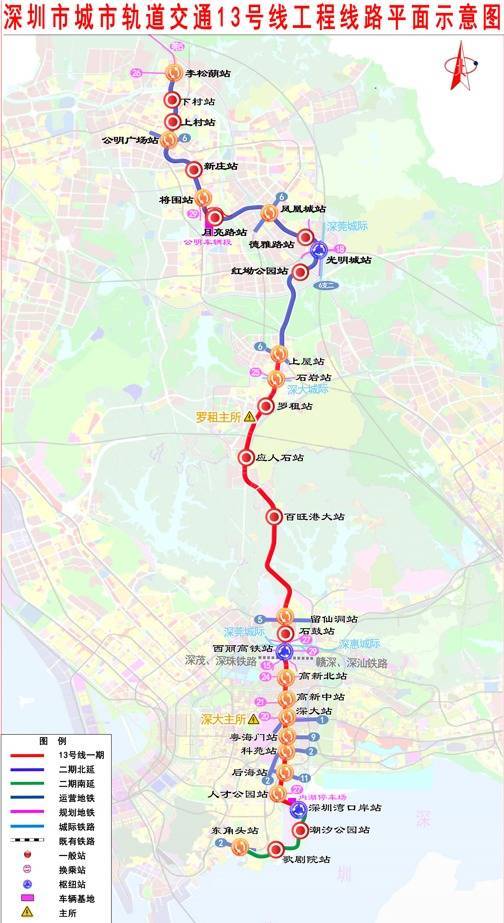 r13号线二期北延工程起于宝安区上屋站(不含),止于光明区李松蓢站,线路全长19.25公里,设站11座,同时预留了未来与东莞地铁衔接的条件。北延工程与13号线一期工程贯通运营后,将成为串联南山、宝安、光明三个行政区的城市轨道交通干线,可有效缓解深圳西部南北向交通压力,大幅缩短通行时间,提升市民出行体验,同时加强光明科学城与南山科技园、深圳湾超级总部基地的快速联系,进一步推动粤港澳大湾区轨道交通的互联互通。