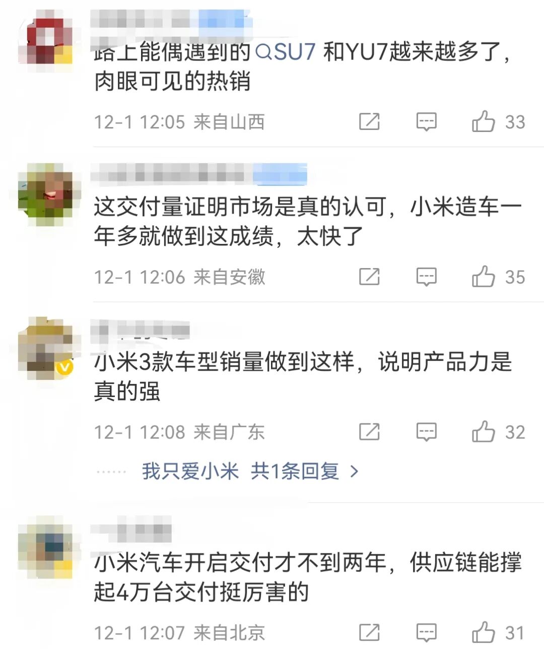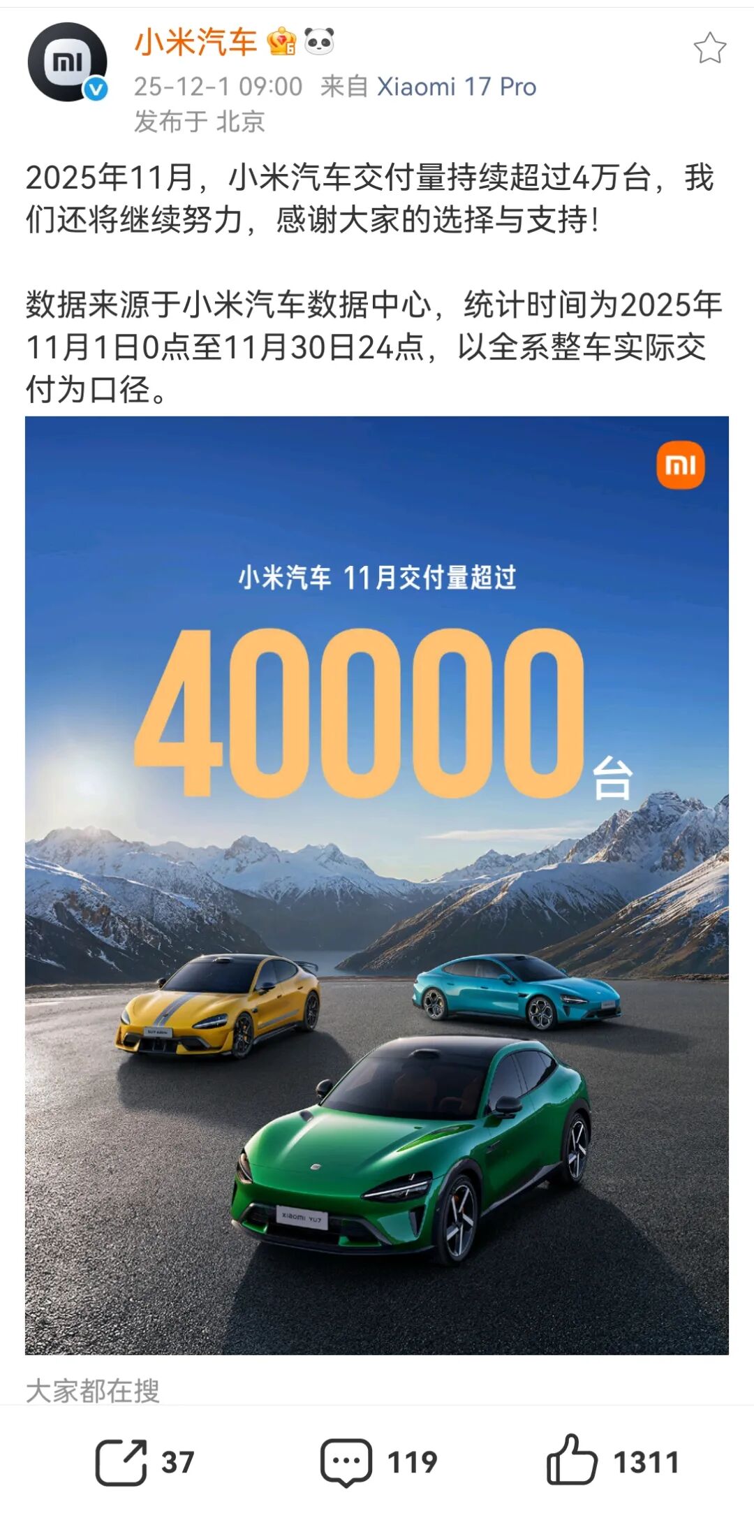 12月1日,小米汽车官方宣布,其11月交付量再度突破4万台。