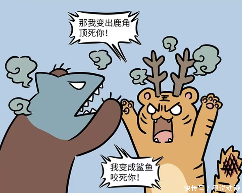 接下来九月在老虎的基础上,变化出鹿角。九月要用鹿角来顶死十一月。可是十一月根本不怕,在大狗熊基础上,将脑袋变成鲨鱼头。九月和十一月,那是谁都不让步,还一直变化模样。那么接下来还会变成什么样子?