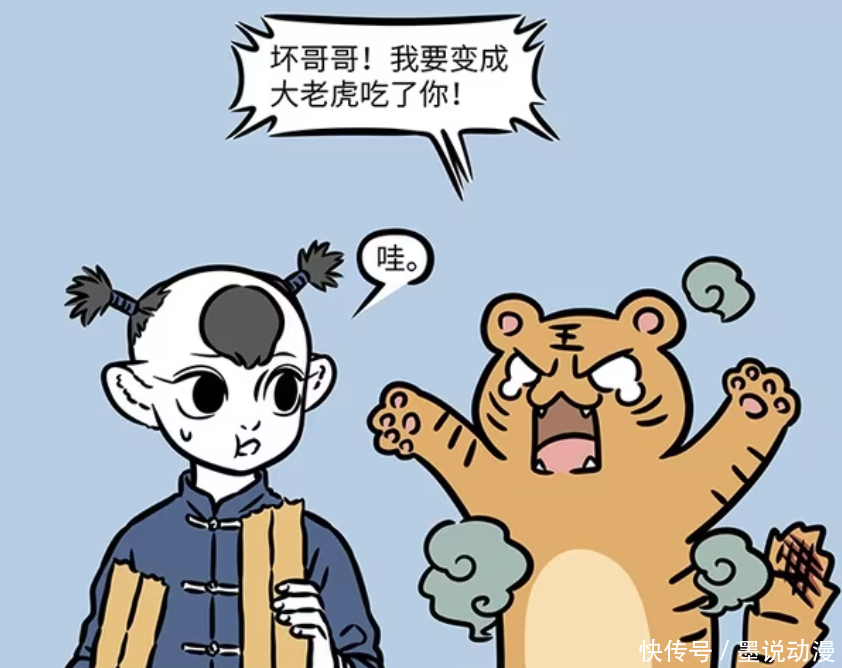 咬了尾巴之后,九月哭了起来,随后更是变成老虎的模样。这时期的九月还是小孩子模样,就算变成老虎,也是可爱风格。不过可以看出九月的尾巴被自己咬伤,她还扬言要吃掉十一月。不过十一月也只是吃惊了一下,他知道如何应对。