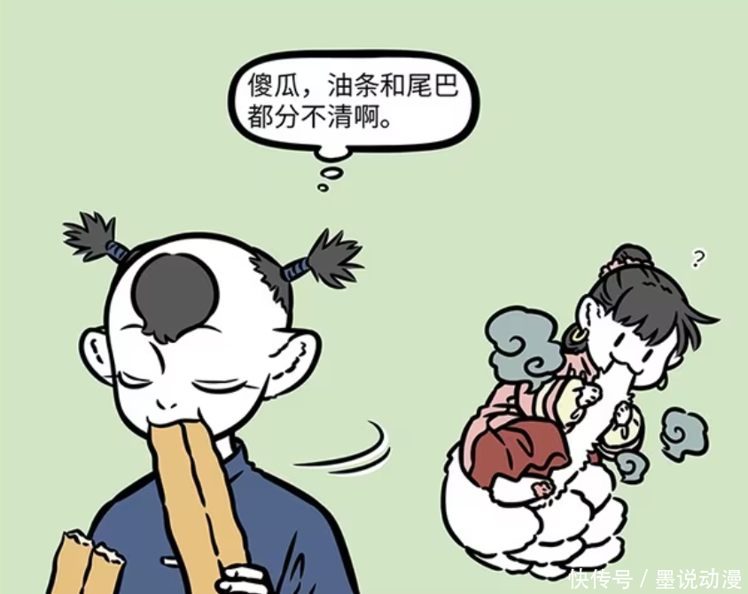这根油条其实是九月的尾巴变化而来,九尾狐不仅可以改变自身模样,还能改变他人的样貌。这是化形术的应用,九月也不知道自己被十一月套路。九月咬了“油条”之后,才发现它变成自己的尾巴。十一月继续嘲笑九月,觉得她连尾巴和油条都分不清楚。不仅如此,十一月还将九月的那根油条吃掉。