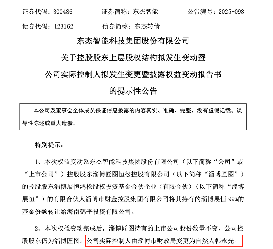 8月26日晚,东杰智能公告称,公司控股股东淄博匠图恒松控股有限公司(下称“淄博匠图”)的控股股东淄博展恒鸿松股权投资基金合伙企业(有限合伙)(下称“淄博展恒”)的有限合伙人淄博市财金控股集团有限公司,将其持有的淄博展恒99%的基金份额转让给海南鹤平投资有限公司。交易价格为16.2亿元。