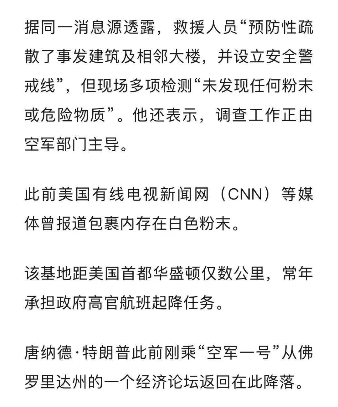 据参考消息援引法新社11月7日报道,美国军方发言人7日证实,在美国总统专机“空军一号”的常驻基地收到一个针对唐纳德·特朗普含“负面信息”的可疑包裹后,7人出现不适短暂就医,其中包括美军现役人员。